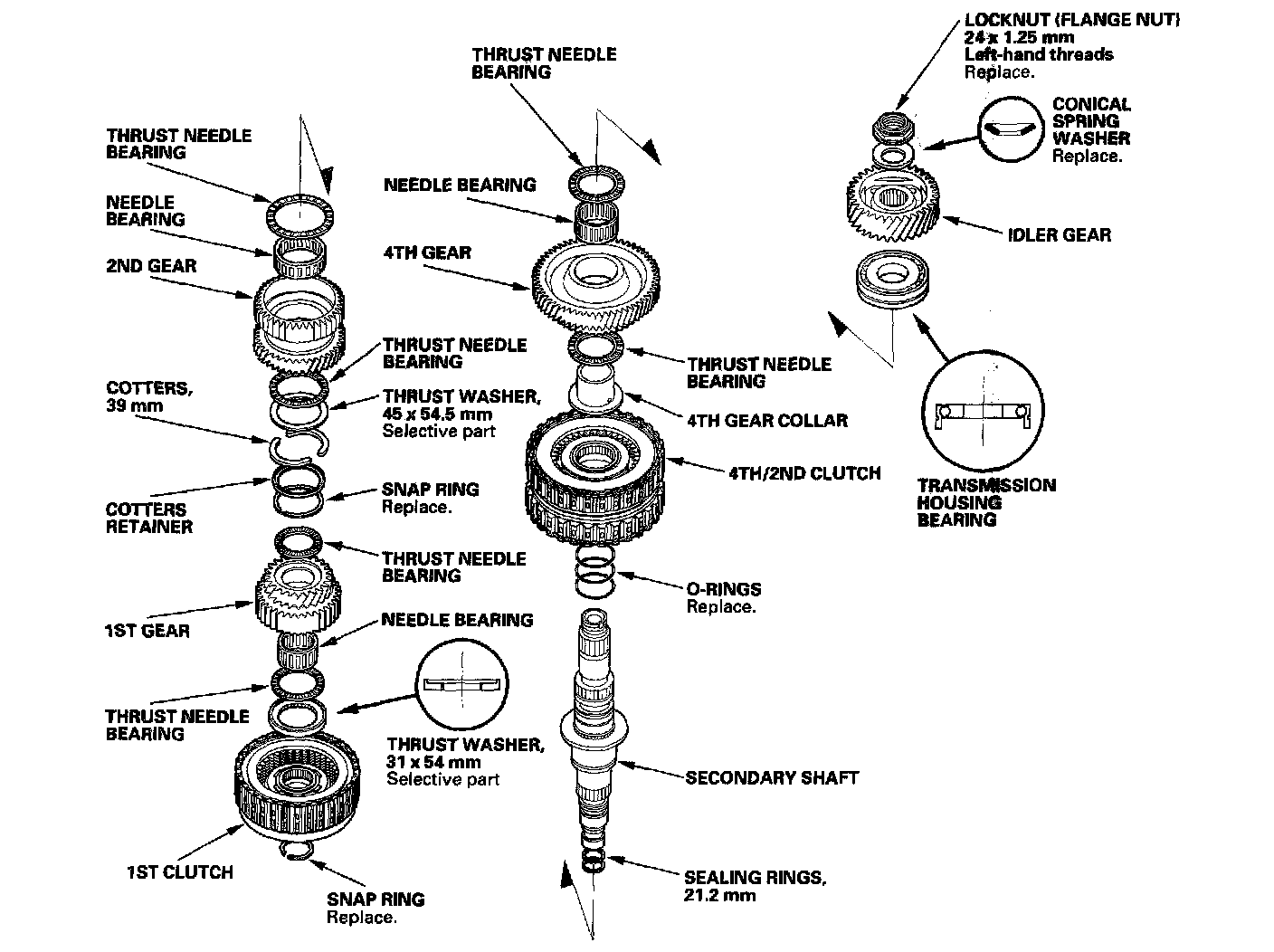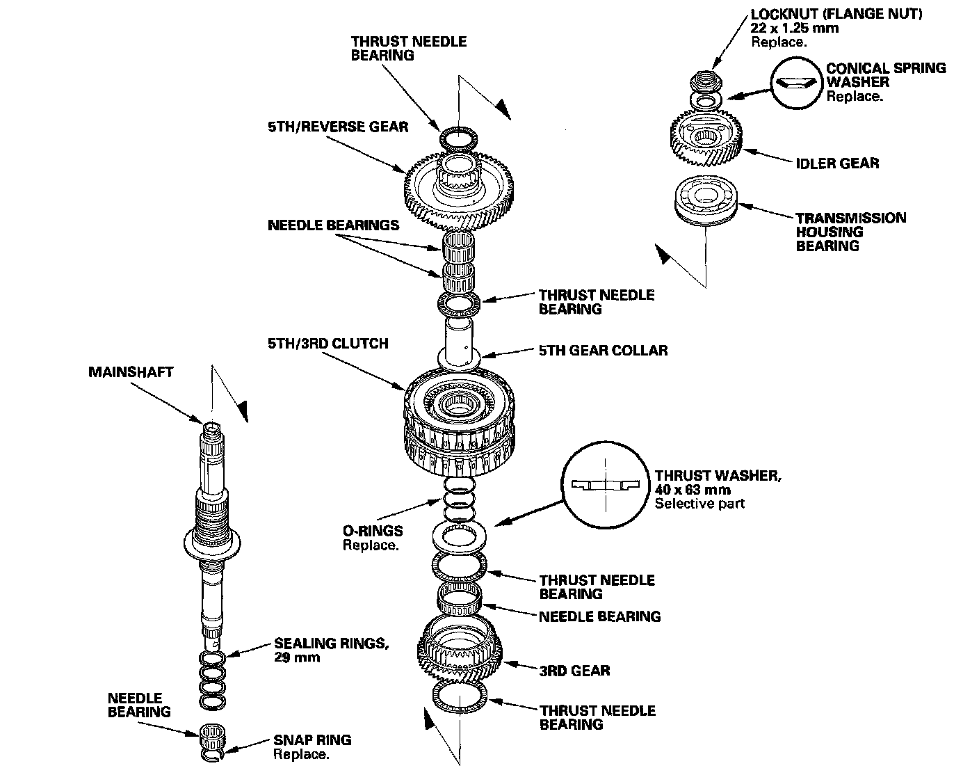 6. Install the conical spring washer, idler gear, and 31 x 54 mm thrust washer in the direction shown.