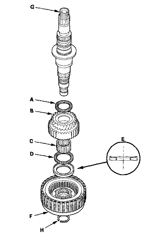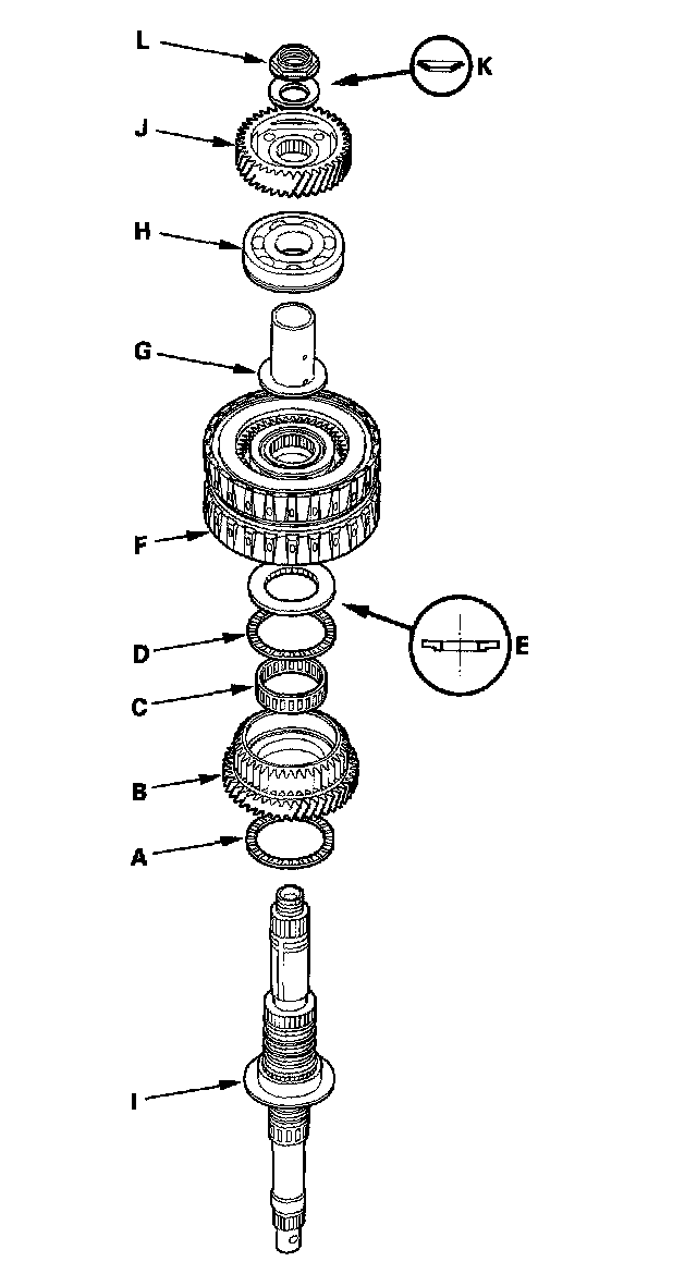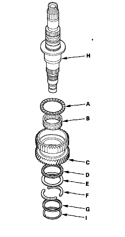 2. Install the thrust needle bearing (A), 3rd gear (B), needle bearing (C), thrust needle bearing (D), 40 x 63 mm thrust washer (E), 3rd/5th clutch (F), 5th gear collar (G), and transmission housing bearing (H) on the mainshaft (I). Do not install the O-rings during inspection.