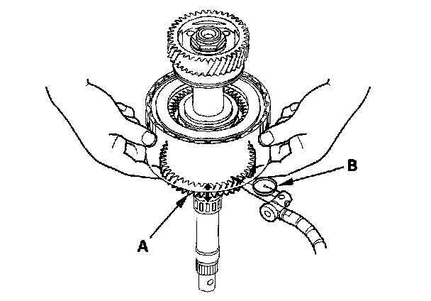 2. Set the dial indicator (A) on the 2nd gear (B).