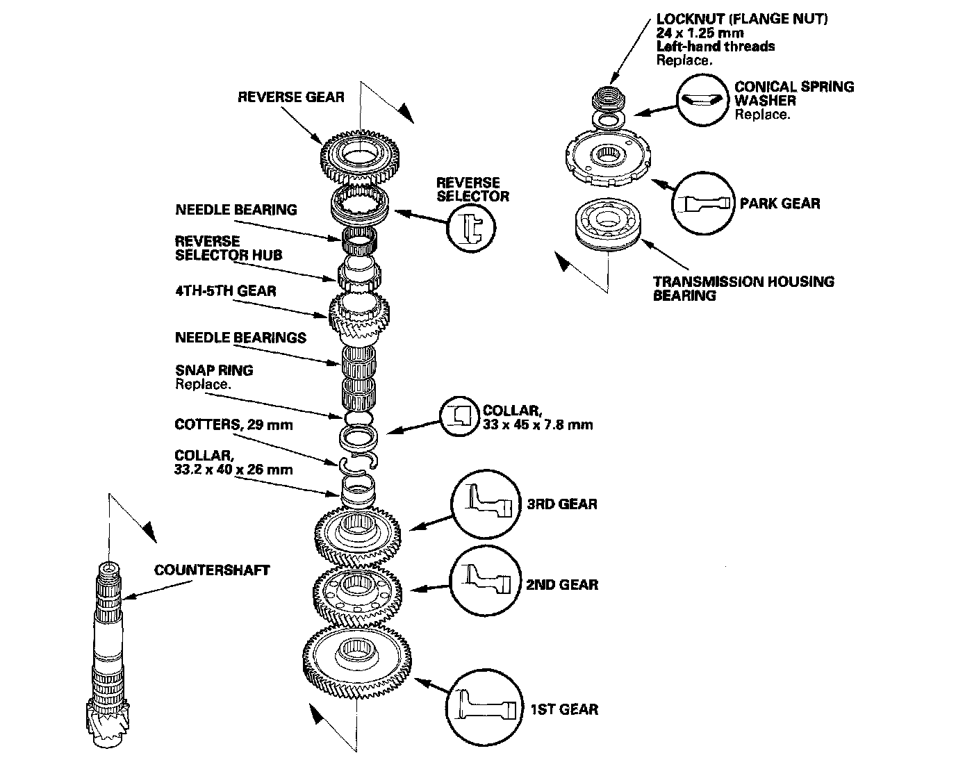 6. Replace the locknut and conical spring washer with new ones when assembling the transmission. The countershaft locknut has left-hand threads.