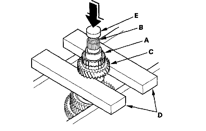1. Remove the reverse selector hub from the countershaft by hand. If the reverse selector hub (A) cannot be removed by hand, it is press-fitted to the countershaft (B), and remove it from the countershaft with a press. Place the 4th-5th gear (C) on press bases (D), and place a shaft protector (E) between the countershaft and press to prevent damaging the countershaft.