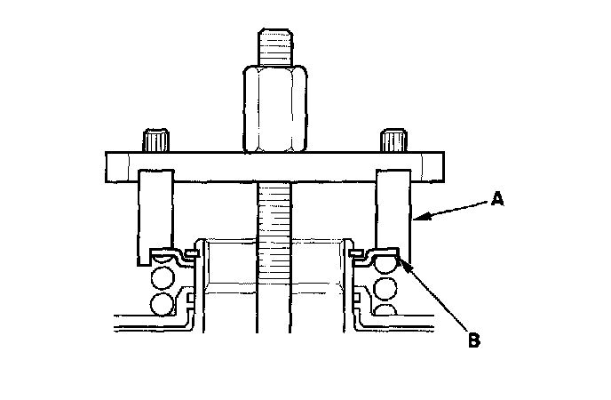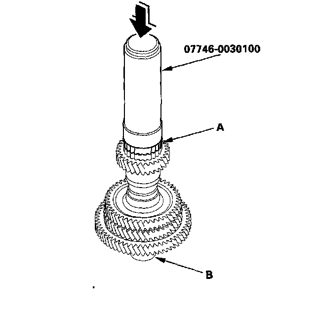 3. Slide the reverse selector hub (A) over the countershaft (B), then press it in place with the special tool and a press.