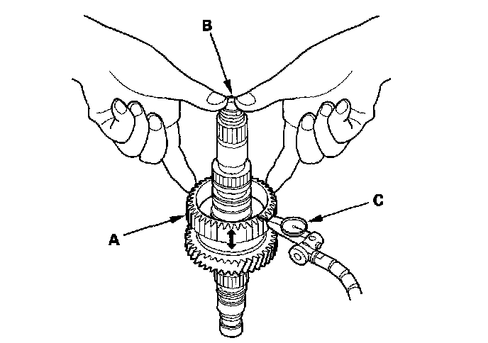 3. Lift the 2nd gear (A) up while holding the secondary shaft (B), and use the dial indicator (C) to read the 2nd gear axial clearance.