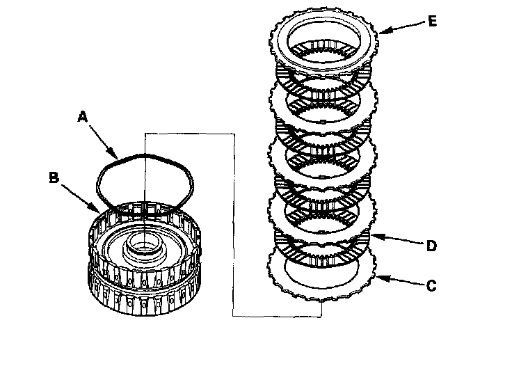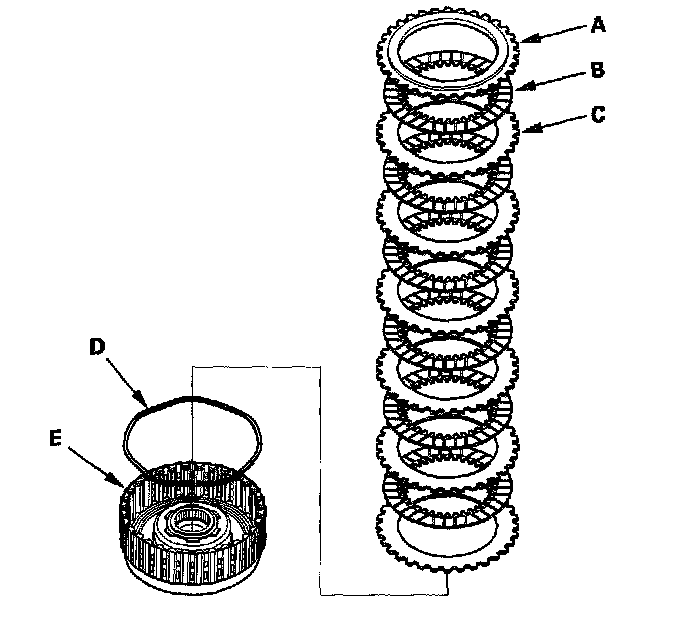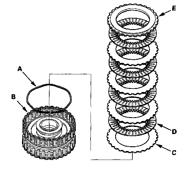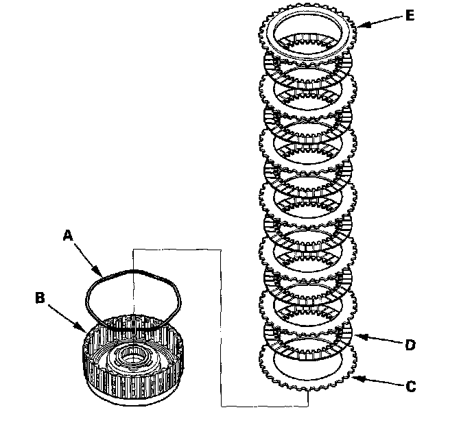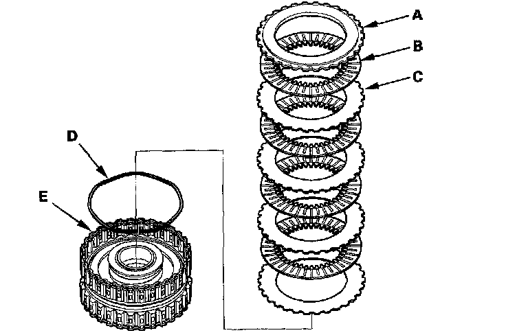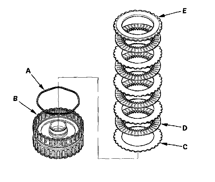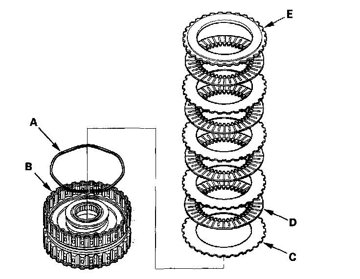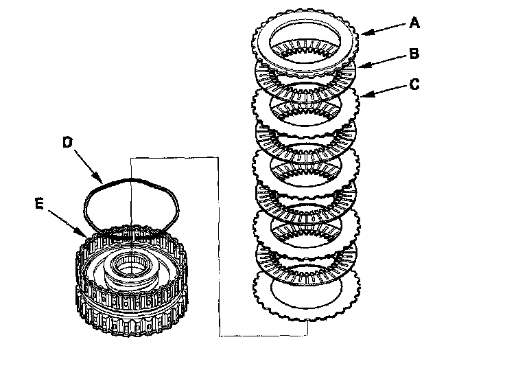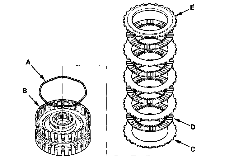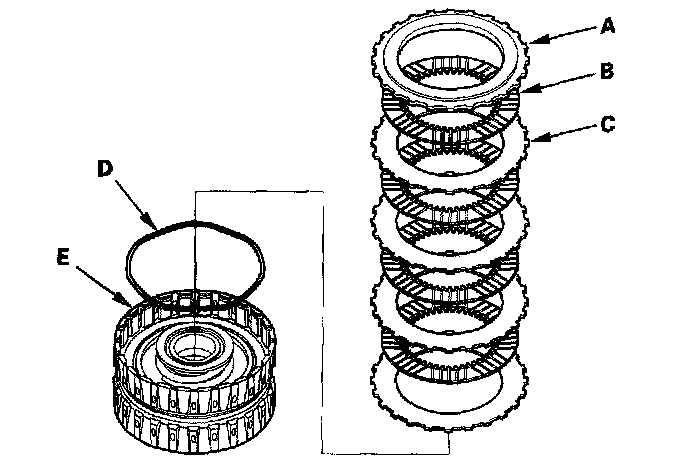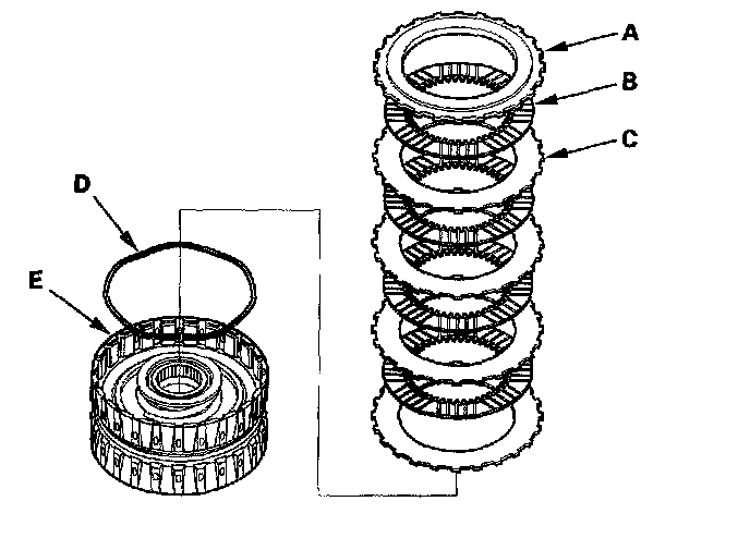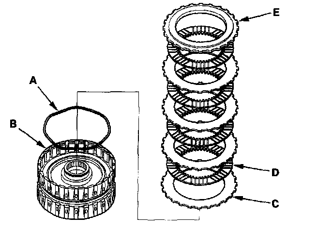 6. Install the waved spring (A) in the 3rd clutch drum (B). Starting with the clutch waved-plate, alternately install the waved-plates (C) (4) and discs (D) (4). Install the clutch end-plate (E) with the flat side down on the top disc.