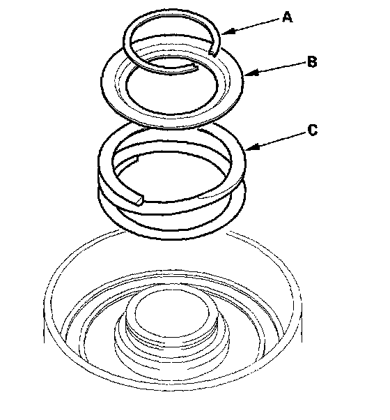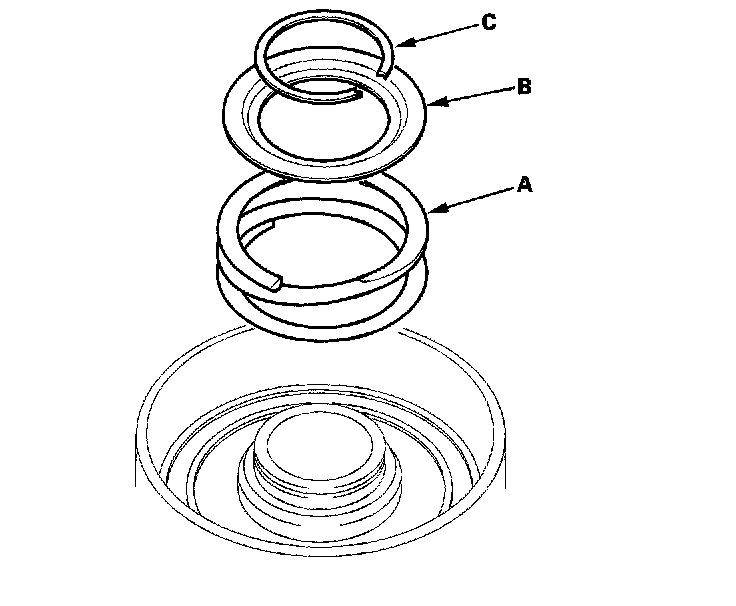 4. Install the return spring (A) and spring retainer (B), and position the snap ring (C) on the spring retainer.