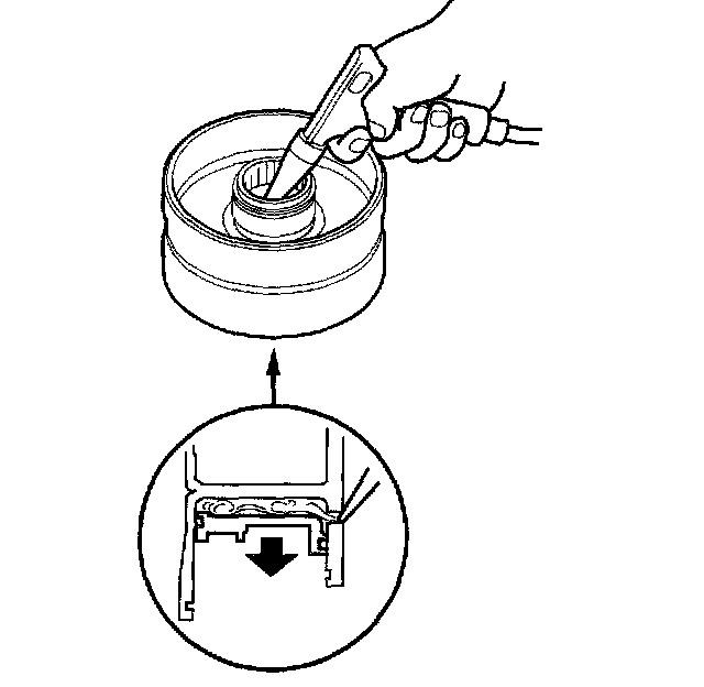 13. Wrap a shop rag around the clutch drum, and apply air pressure to the fluid passage to remove the piston. Place a finger tip on the other passage while applying air pressure.