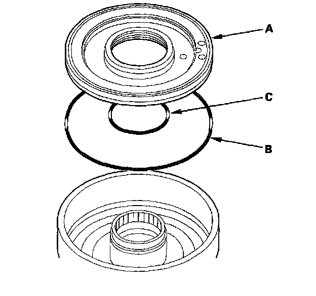 14. Remove the clutch piston (A), and remove the outer O-ring (B) and inner O-ring (C) from the piston.