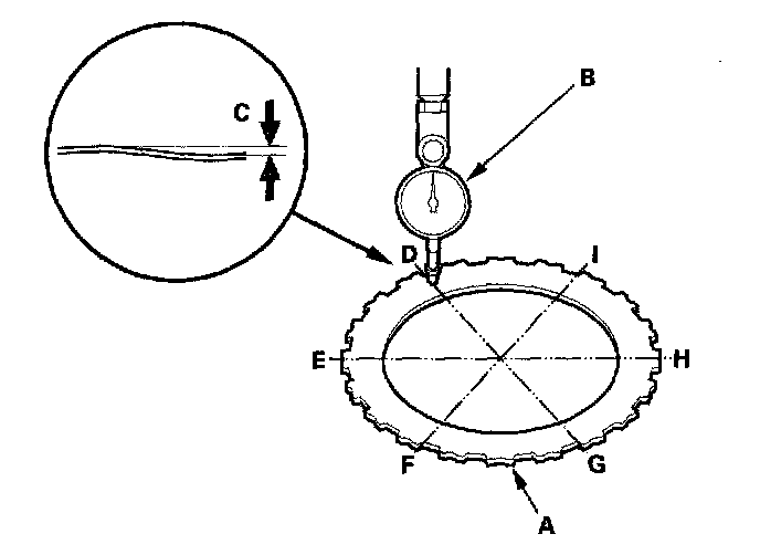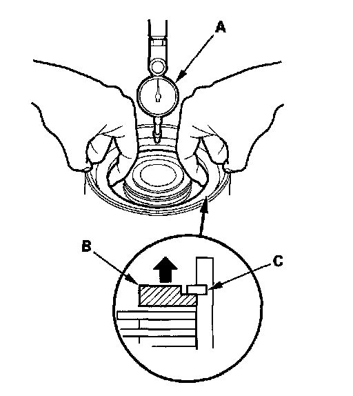 10. Zero the dial indicator with the clutch end-plate lifted up to the snap ring (C).