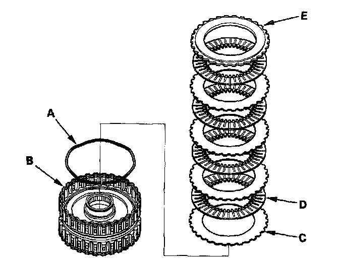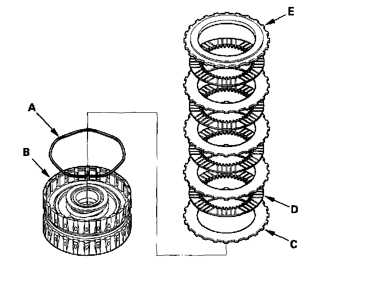 12. Install the waved spring (A) in the 4th clutch drum (B). Starting with the clutch flat-plate, alternately install the flat-plates (C) (4) and discs (D) (4). Install the clutch end-plate (E) with the flat side down on the top disc.