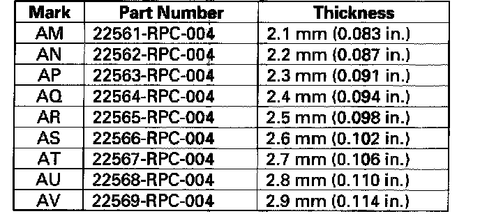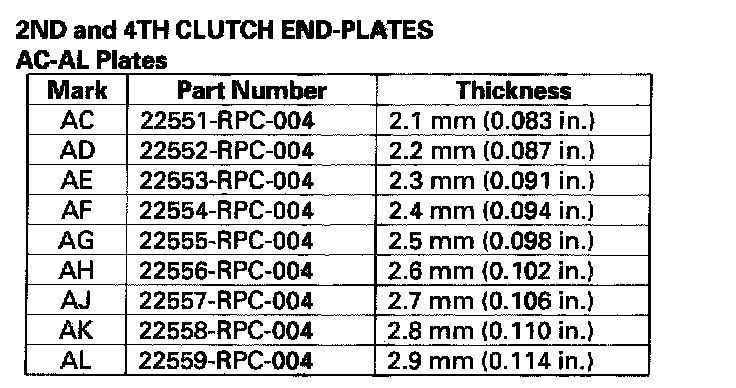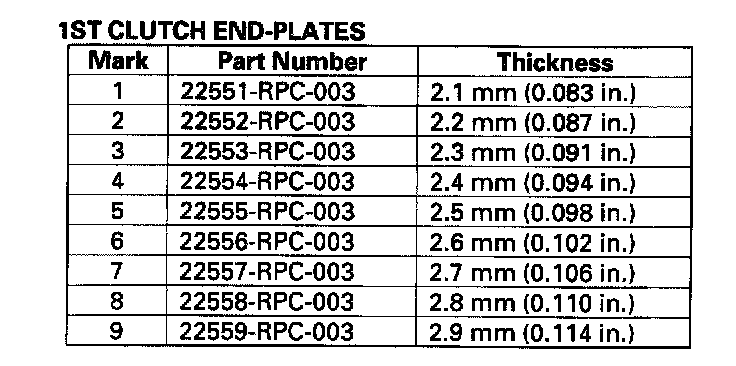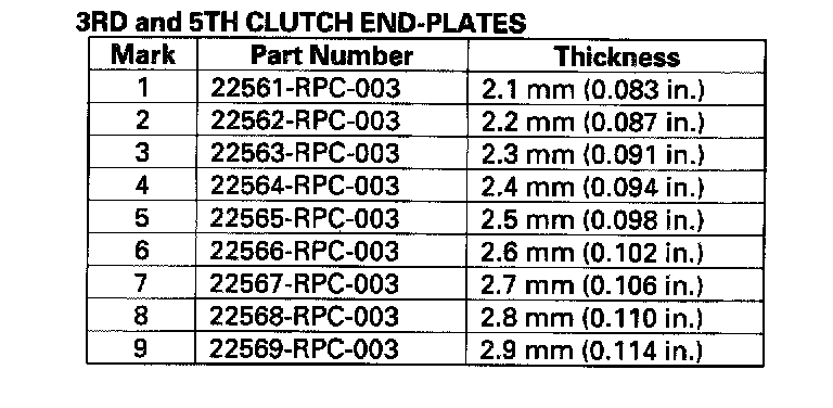 14. If the clearance of the 1st, 3rd, or 5th clutch is out of the service limit, select a new clutch end-plate from the following table.