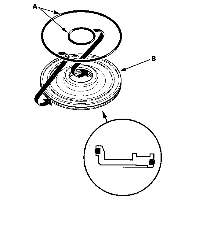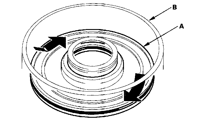 3. Install the clutch piston (A) in the clutch drum (B) while applying pressure and rotating to ensure proper seating. Do not pinch the O-ring.