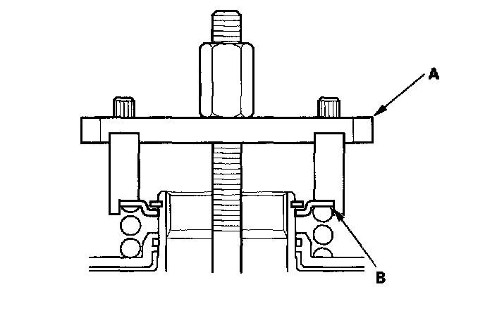 6. Be sure the special tool (A) is adjusted to have full contact with the spring retainer (B).