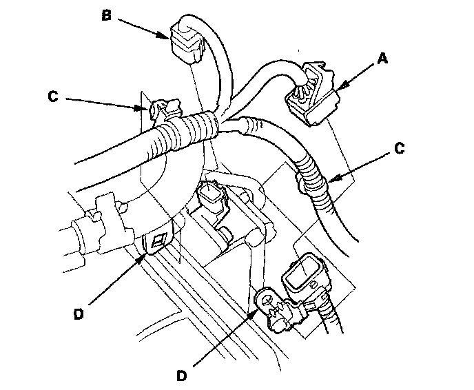 21. Disconnect the shift solenoid harness connector (A) and the 3rd clutch transmission fluid pressure switch connector (B), and remove the harness clamps (C) from the clamp brackets (D).