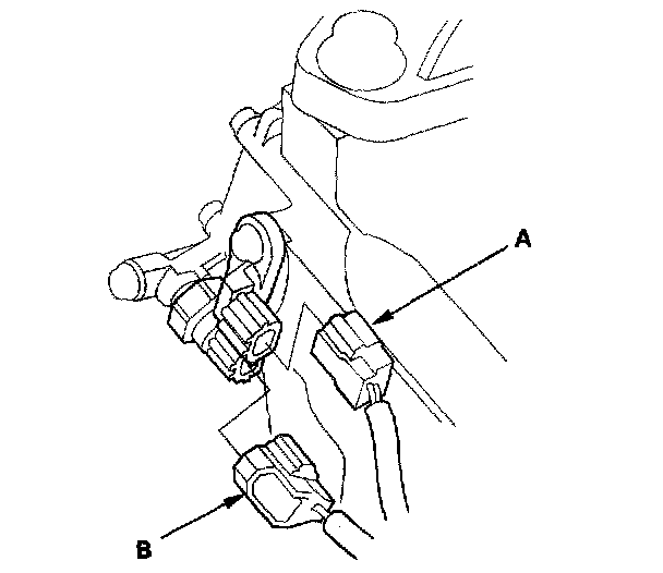 18. Disconnect the input shaft (mainshaft) speed sensor connector (A) and the 2nd clutch transmission fluid pressure switch connector (B).