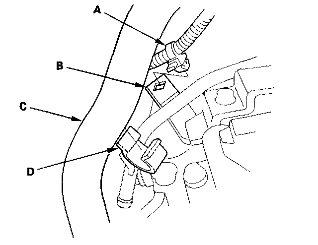 22. Remove the harness clamp (A) from its bracket (B), and remove the radiator hose (C) from the clamp (D).