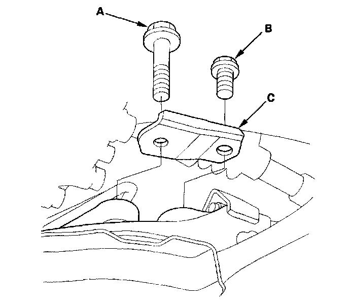 30. Remove the steering gearbox mounting bolt (rear) (A), stiffener mounting bolt (B), and stiffener (C).