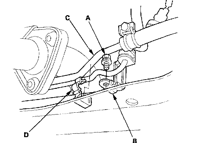 33. Remove the bolt (A) securing the power steering fluid line bracket (B) on the right of the front subframe, and remove the power steering fluid line (C) from the clamp (D).