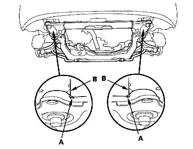 35. Note the reference marks (A) on both sides of the subframe that line up with the body (B).