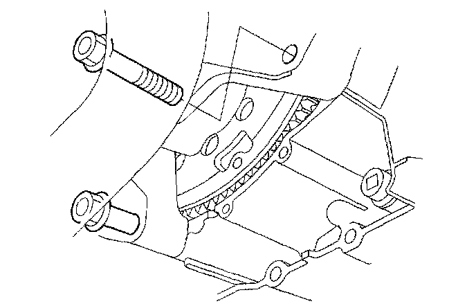 44. Remove the torque converter cover (A), and remove the drive plate bolts (B) (8) while rotating the crankshaft pulley.