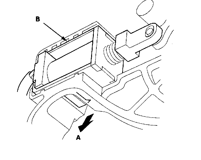 3. Release the shift lock solenoid lock (A), then remove the shift lock solenoid (B).