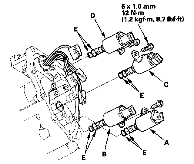 8. Install new O-rings (two O-rings per solenoid valve) (E) on the reused solenoid valve.