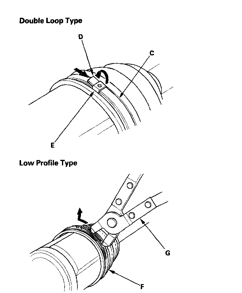 ^ If the boot band is a low profile type (F), pinch the boot band using the commercially available boot band pincers (G).