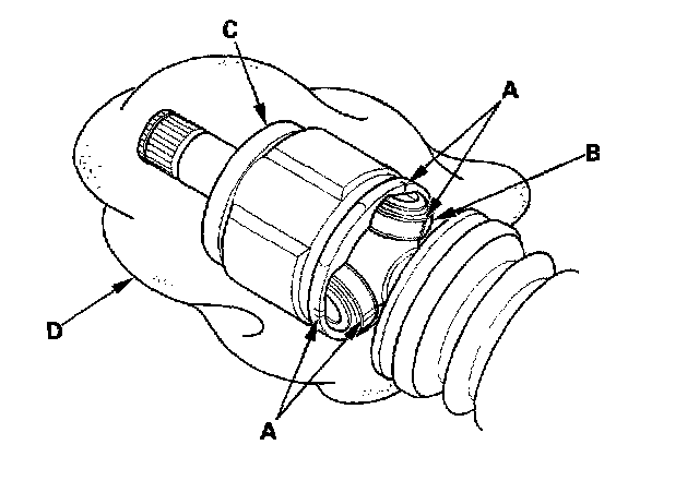 3. Make a mark (A) on each roller (B) and inboard joint (C) to identify the locations of rollers and grooves in the inboard joint. Then remove the inboard joint on the shop towel (D). Be careful not to drop the rollers when separating them from the inboard joint.