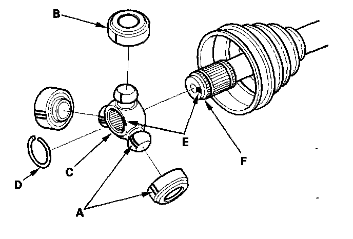 6. Mark (E) the spider (C) and driveshaft (F) to identify the position of the spider on the shaft.