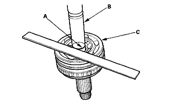 4. Make a mark (A) on the driveshaft (B) at the same position of the outboard joint end (C).