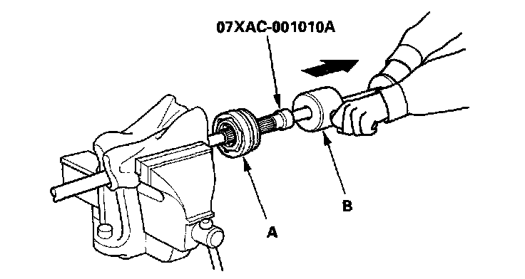 6. Remove the outboard joint (A) using the special tool and a commercially available 5/8"-18 UNF slide hammer (B).