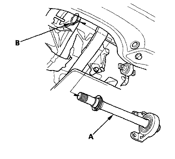 4. Remove the intermediate shaft (A) from the differential. Hold the intermediate shaft horizontal until it is clear of the differential to prevent damage to the differential oil seal (B).