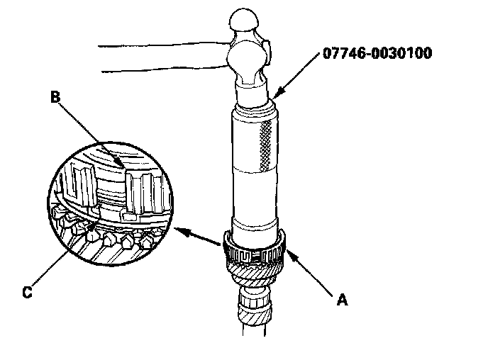 4. Install the 3rd/4th synchro hub (A) by aligning the synchro cone fingers (B) with the grooves in the 3rd/4th synchro hub (C).
