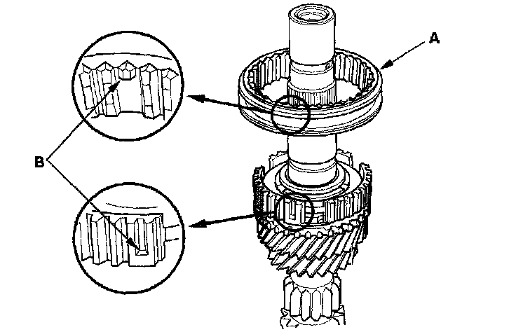 6. Install the 3rd/4th synchro sleeve (A) by aligning the stops (B) with the 3rd/4th synchro sleeve and hub. After installing, check the operation of the 3rd/4th synchro hub set.