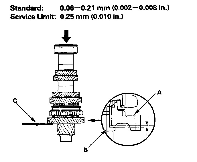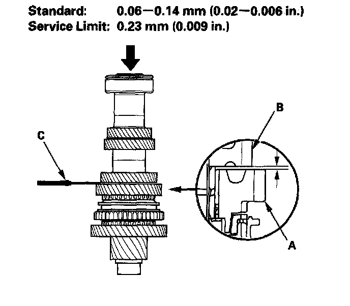 Countershaft Assembly Clearance Inspection1. Measure the clearance between 1st gear (A) and the distance collar (B) with a feeler gauge (C). If the clearance is more than the service limit, go to step 2.