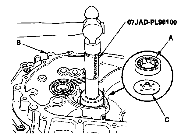 2. Position the oil guide plate C and new needle bearing (A) in the bore of the clutch housing (B).