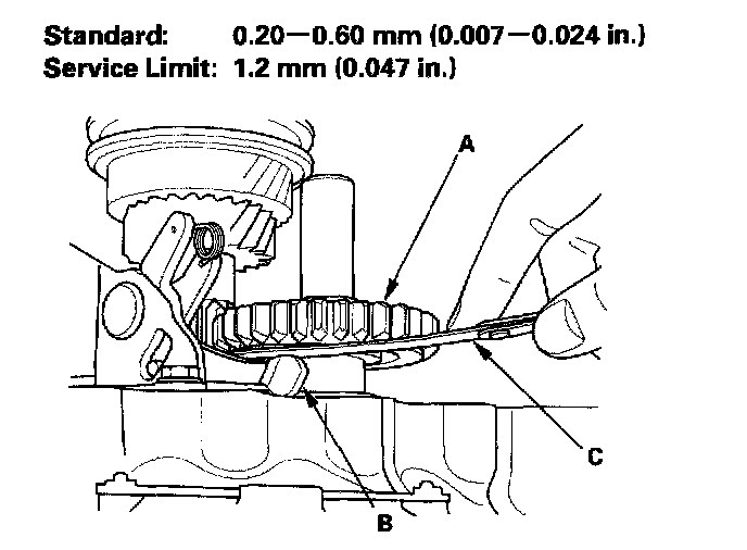 Reverse Shift Fork Clearance Inspection1. Measure the clearance between the reverse idler gear (A) and the reverse shift fork (B) with a feeler gauge (C). If the clearance is more than the service limit, go to step 2.