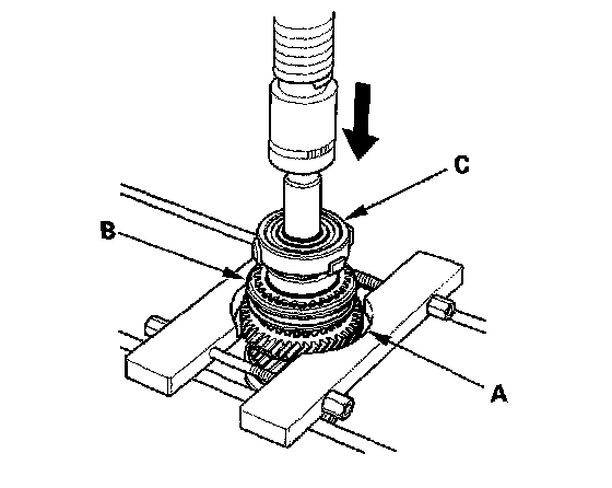 Mainshaft Disassembly1. Support 5th gear (A) on steel blocks, and press the mainshaft out of the 5th synchro hub (B) and ball bearing (C). Use of a jaw-type puller can damage the gear teeth.