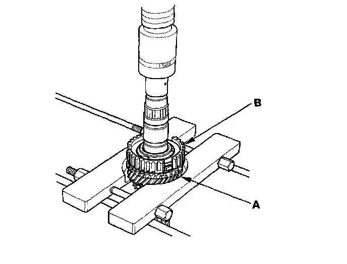 2. Support 3rd gear (A) on steel blocks, and press the mainshaft out of the 3rd/4th synchro hub (B). Use of a jaw-type puller can damage the gear teeth.