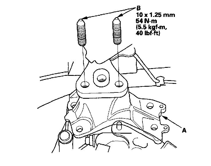 18. Install the transmission mounting bracket base (A) and stud bolts (B).