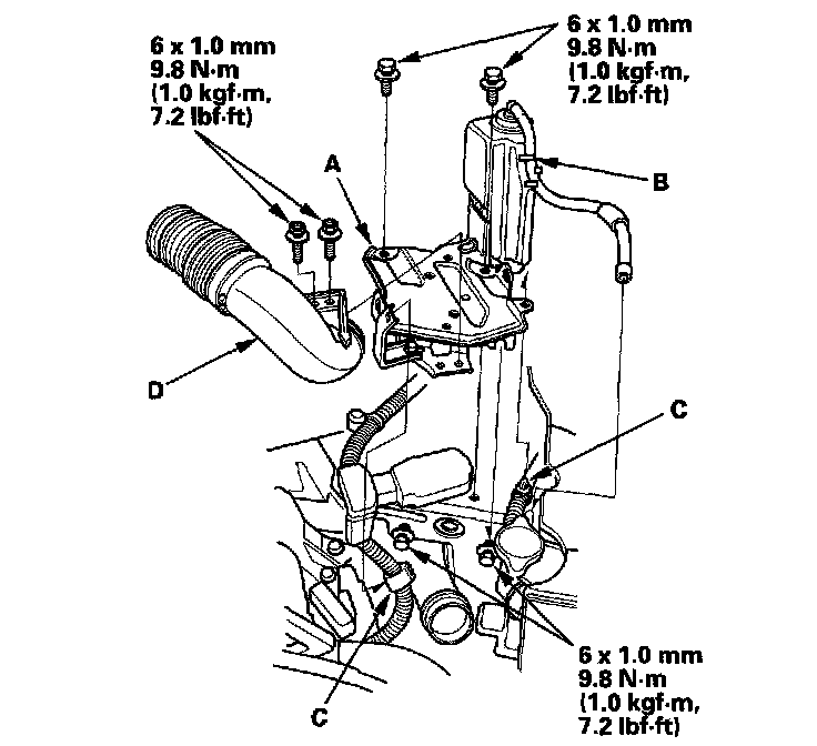 25. Install the harness holder bracket (B) and air cleaner housing bracket on the cylinder head,