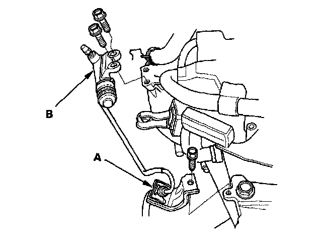 5. Remove the clutch line bracket (A), then carefully remove the slave cylinder (B) to avoid bending the clutch line. Do not press the clutch pedal once the slave cylinder has been removed.