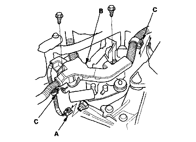 6. Disconnect the back-up light switch connector (A), then remove the engine harness cover (B) and the harness clips (C).