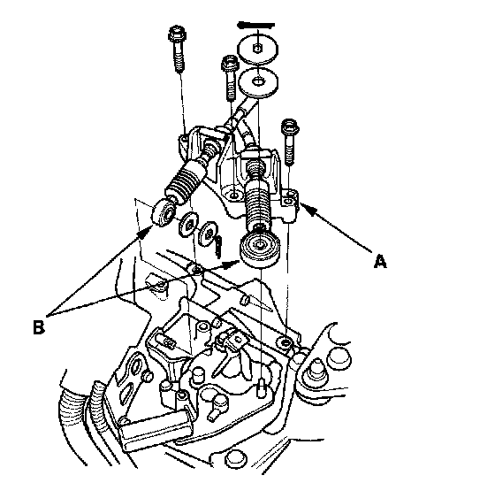 7. Remove the cable bracket (A), then disconnect the cables (B) from the top of the transmission housing. Carefully remove both cables and the bracket together to avoid bending the cables.