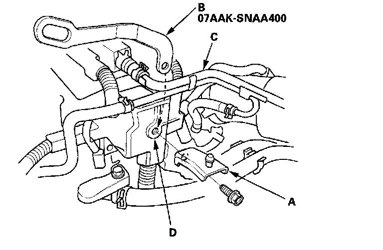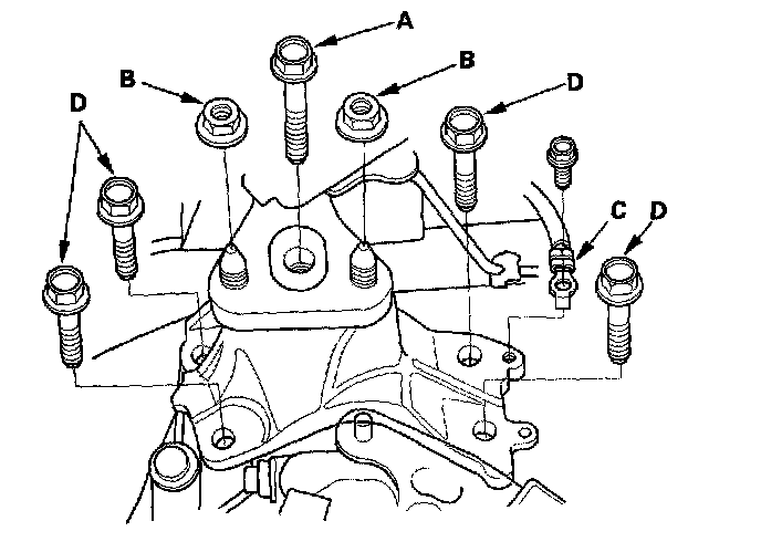 13. Remove the transmission mounting bolt (A) and nuts (B), then remove the ground cable (C). Remove the transmission mounting bracket base bolts (D).