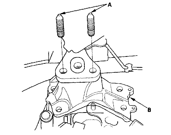 14. Remove the stud bolts (A) and the transmission mounting bracket base (B).