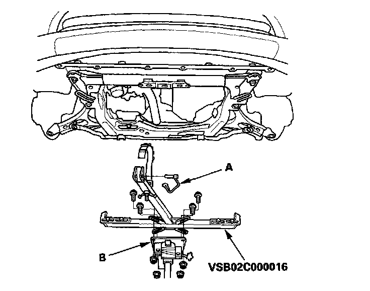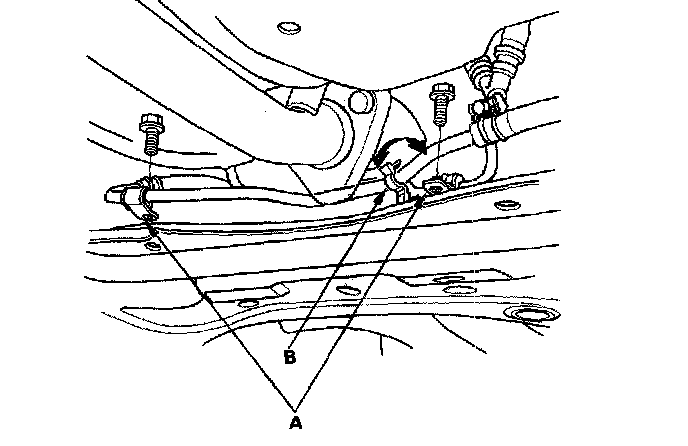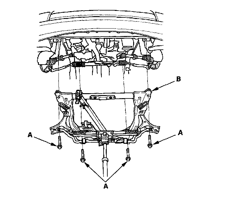 27. Remove the front suspension subframe mounting bolts (A) and front suspension subframe (B).