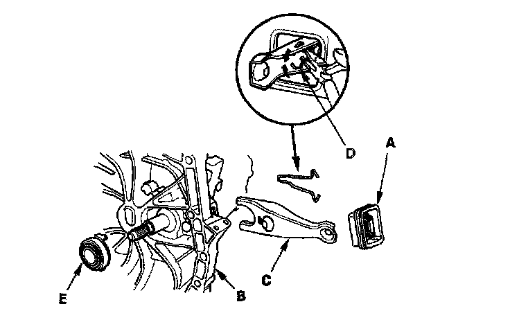 34. Remove the release fork (C) from the clutch housing by squeezing the release fork set spring (D) with pliers. Remove the release bearing (E).