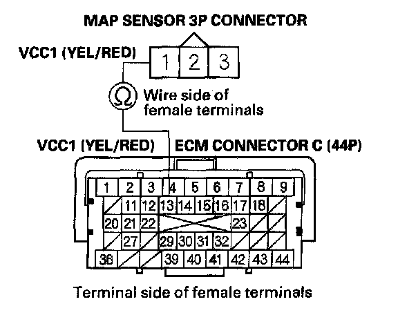 11. Check for continuity between ECM connector terminal C13 and MAP sensor 3P connector terminal No. 1.