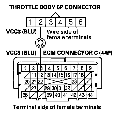 15. Check for continuity between ECM connector terminal C12 and throttle body 6P connector terminal No. 2.