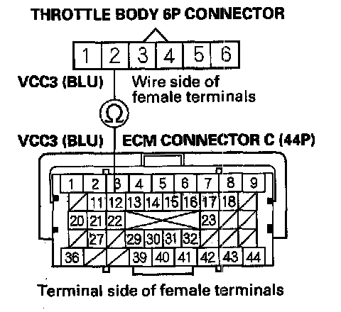 15. Check for continuity between ECM connector terminal C12 and throttle body 6P connector terminal No. 2.